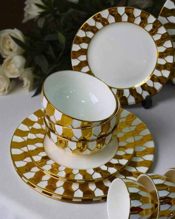 Crafted from fine bone china with elegant electrogold detailing, this set brings a royal touch to every dining moment.