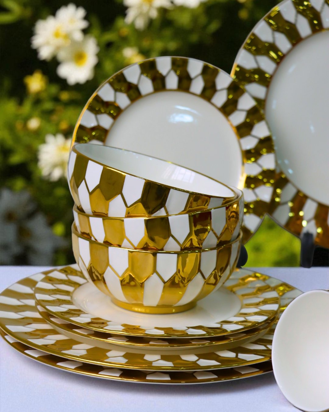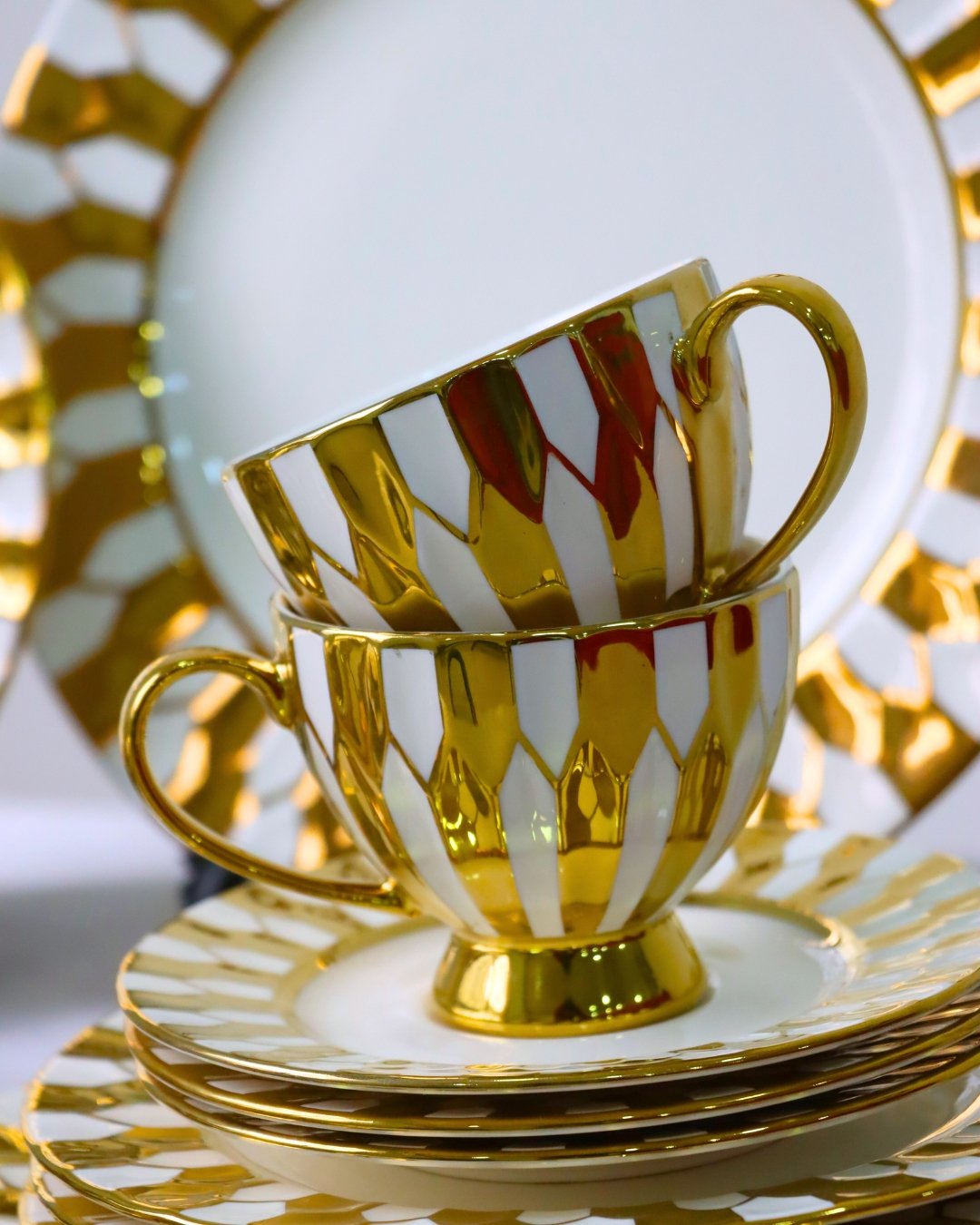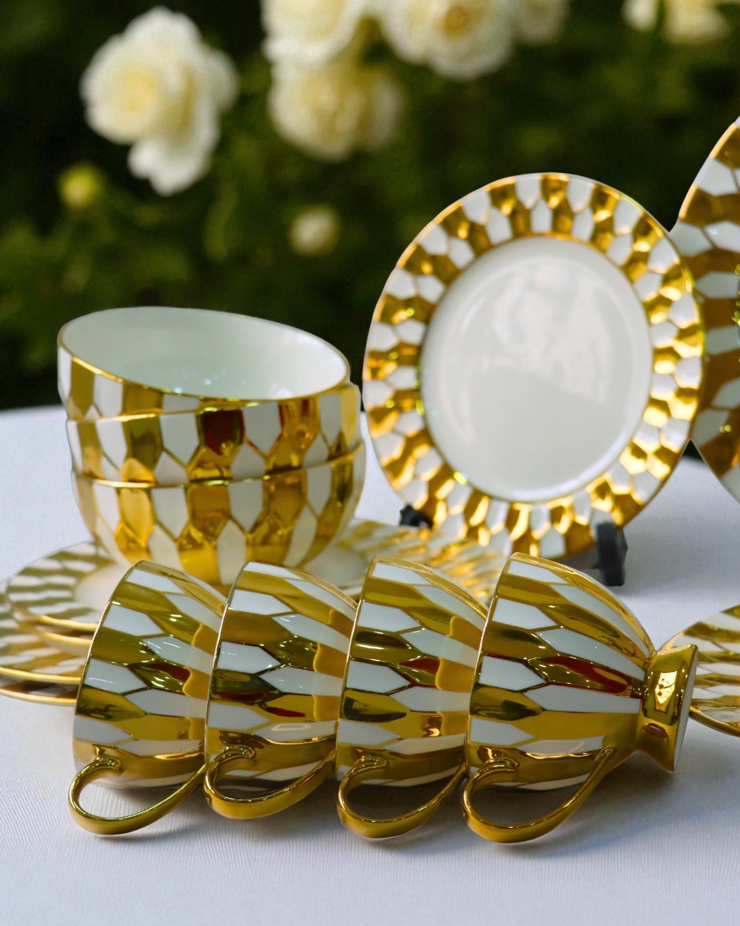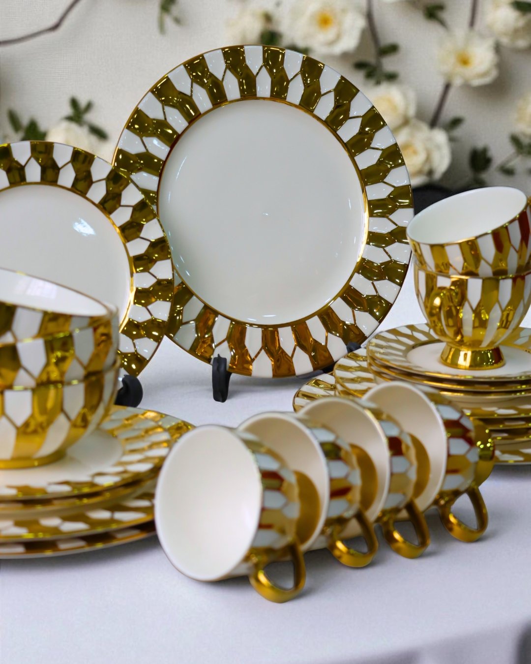 Crafted from fine bone china with elegant electrogold detailing, this set brings a royal touch to every dining moment.